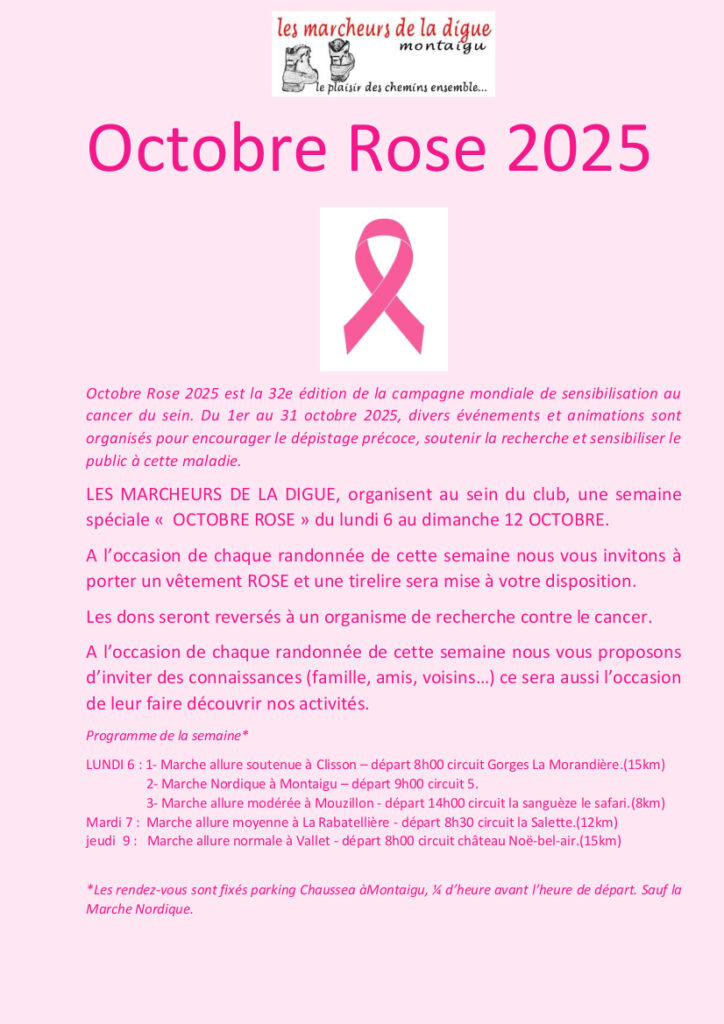 OCTOBRE ROSE : les marcheurs de la digue se mobilisent la semaine du 6 au 12 octobre ( voir ci-dessous l’affiche).
